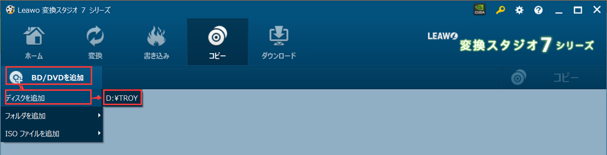 DVDコピー機能画面で「BD/DVDを追加」をクリックして、DVDフォルダーを取り込みます。