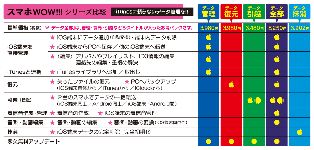 データ全部は、管理・復元・引越の強力な3製品に、着信音や音楽・動画を編集するアプリケーションを追加したお得なパッケージになっています。